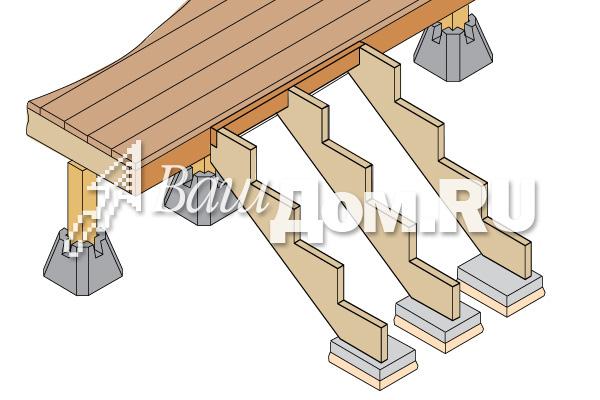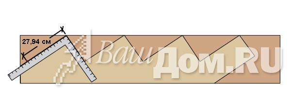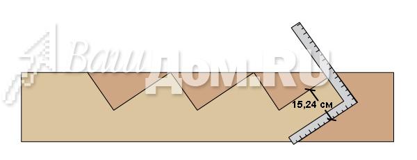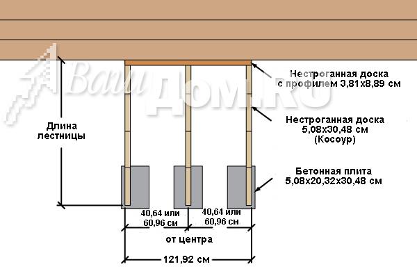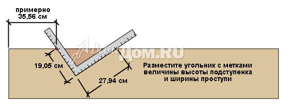 Термины Шаг 1: Определение общего подъема лестницы Для начала надо определить верхний уровень Вашей лестницы. С помощью уровня, который поможет соблюсти горизонтальность, обозначьте верхнюю линию. Затем необходимо оценить возможную длину лестницы. Изучите место, оцените возможное число ступеней лестницы и умножьте на 27,9 см. Мы прикидываем, что у нас будет лестница из четырех ступеней. Теперь на расстоянии длины лестницы опускаем вертикаль и замеряем общую высоту лестницы.(Прим. от редактора: Вертикаль можно опустить с помощью веревки с грузом наконце). Нельзя опускать вертикаль от верхнего уровня, не отложив расстояние длины лестницы, т.к. возможно на этом расстоянии поверхность земли имеет перепады уровней. ![]() Шаг 2: Определение Высоты каждого подступенка Высота каждого подступенка должна быть одинаковой. Типичная высота для подступенка между 15,2-19,7 см. Алгоритм определения высоты подступенка: 1) Разделите общую высоту лестницы на 17,8 см, Вы получите количество шагов, илиточнее количество ступеней. Например: 76,2 см делим на 17,8 см = 4,3 2) Округляем до целого значения в большую или меньшую сторону. Например: получаем 4 ступени 3) Делим общую высоту на количество ступеней и получаем фактическую высоту подступенка. Пример: 76,2 см делим на 4 = 19,0 см). 4) Если расстояние является не приемлемым, то можно добавить количество шагов (ступеней) или убрать. Пример: 76,2 см делим на 5 = 15,2 см. ![]() Шаг 3: Определение ширины проступи Ширина проступи - это горизонтальное расстояние одного шага.Существуют два типа изготовления проступи. 1) Две доски 5,08х15,24 см, уложенные рядом и равные ширинепроступи 27,94 см. 2) Одна цельная доска 5,08х30,48 см, равная ширине проступи - 28,58 см (5,08х30,48 см - 5,08 это толщина доски, 30,48 - это ширинадоски. Статья приводится, как есть, поэтому сохранены стандарты. Добавлено drev-massiv.ru) ![]() Шаг4: Определение ширины лестницы Ширина лестницы - это индивидуальное предпочтение. Как правило, лестницы строятся шириной не менее 80 см. Если вы используете доски 5,08х15,24 см, то постарайтесь выдерживать ширину с приростом в 30,48 см(91,44; 121,92; 152,4; 182,88 см и т.д.). Если вы используете доски 3,2х15,24 см или композитный настил (комбинированный), то постарайтесь сохранять ширину кратной 40,64 см (81,28; 121, 92;162,56; 203,2 см и т.д.) В этом примере мы будем использоватьнастил 5,08х15,24 см для постройки лестницы шириной в 121,92 см. ![]() Шаг5: Определение количества косоуров. Количество косоуров основывается на том, какой ширины будет ваша лестница, и какой тип доски вы будете использовать. Если вы используете 5,08х15,24 см доску, то максимальное расстояние между косоурами не должно превышать 60,96 см от центра. Есливы используете доску 3,2х15,24 см или композитный настил, то максимальноерасстояние между косоурами не должно превышать 40,64 см от центра. Разделите ширину на 40,64 см или на 60,96 см и прибавьте 1. Например: 121,92 см/ 60,96 см=2 2+1=3 итого необходимо 3 косоура. ![]() Шаг6: Разметка вырезов под ступени (шагов). Вырез первого шага на косоуре ![]() Для этого вам нужен угольник. (Прим.от автора: простой угольник с прямым углом). На одной стороне угольника от угла отметьте ширину проступи, а на другой стороне высоту подступенка. Эти метки пригодятся вам для быстрой разметки вырезов под ступени (шагов) на косоуре. Разместите первую метку, которую высделали на угольнике, на расстоянии примерно 35,56-40,64 см от конца доски.Вторую метку сов